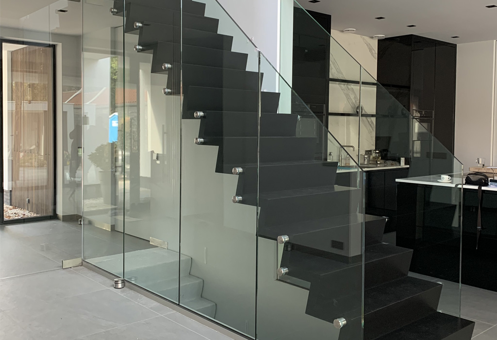 Rubberwood vrijdragende Z-trap. Voorzien van glas en zwart afgelakt